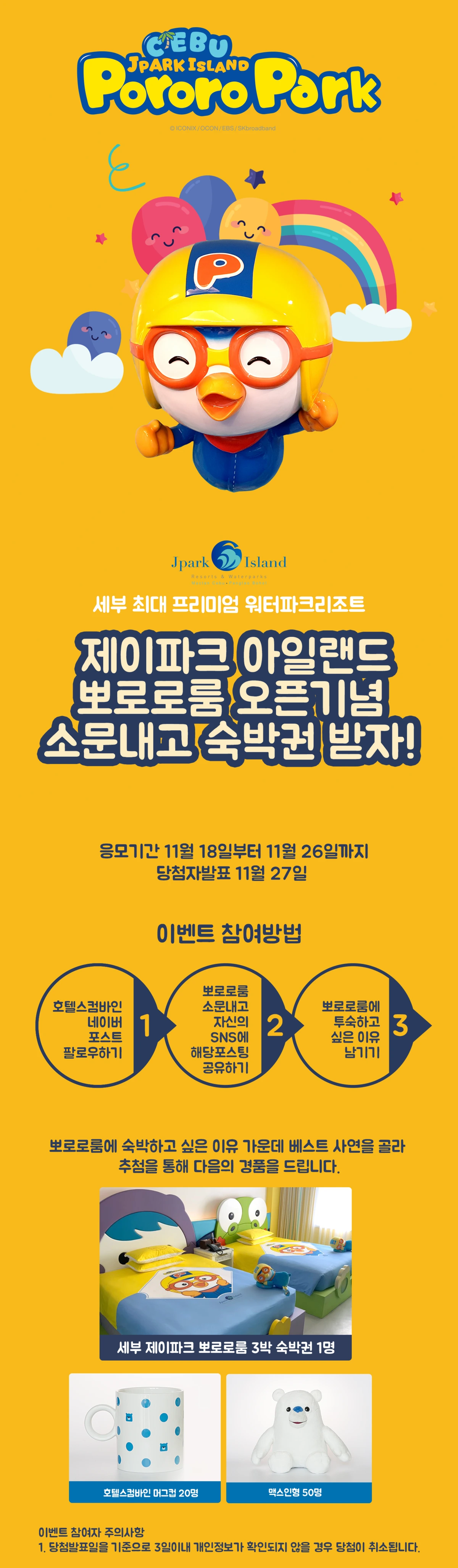 세부에 위치한 프리미엄 워터파크 리조트 제이파크 아일랜드 리조트 & 워터파크! 최근 필리핀 최대 규모의 실내 테마파크인 ‘뽀로로파크’와 세부 최초 캐릭터룸인 ‘뽀로로 캐릭터 객실’을 오픈했답니다. 오픈기념하여 호텔스컴바인과 함께 이벤트를 마련했는데요. 만나볼까요?