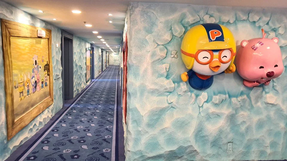 객실이 위치한 층 엘리베이터는 뽀로로의 눈 덮인 숲 속 마을의 모습을 연출하였으며, 복도 벽면 또한 뽀로로 캐릭터 및 아트워크로 꾸며 객실로 들어가는 내내 기대감을 높였답니다.