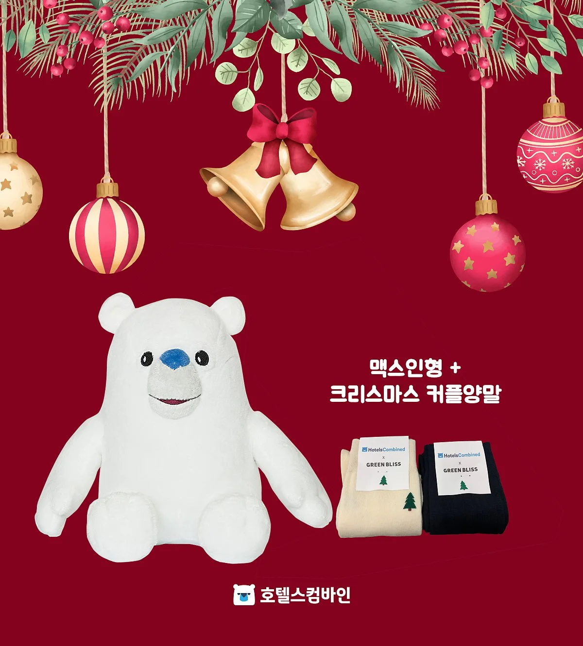 12월 24일부터 글래드 여의도, 메종 글래드 제주에 체크인하는 고객대상으로 아래 선물을 준비했답니다. 바로 호텔스컴바인 맥스인형과 그린블리스 크리스마스커플 양말세트입니다.