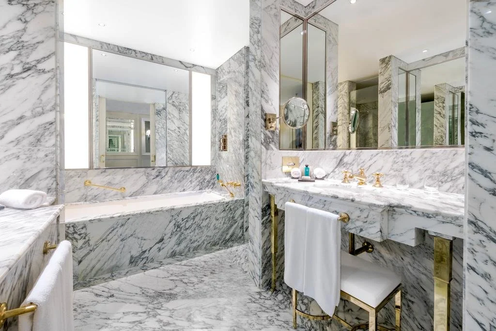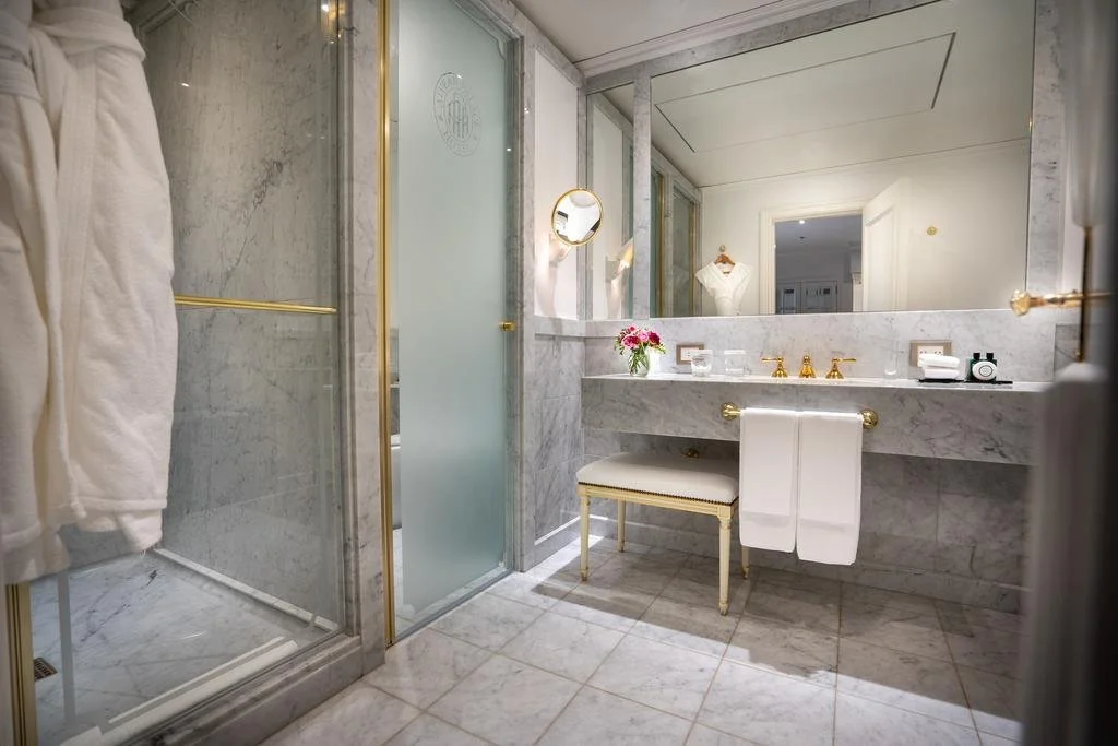 호화로운 대리석 욕실에는 샤워대 및 세면대 욕조 등이 갖추어져 있으며 하얀색, 검은색, 회색이 한데 섞인 대리석 바닥과 벽면을 밝은 조명이 비추고 있어 사진찍기 좋은 사진맛집을 느낄 수 있답니다.