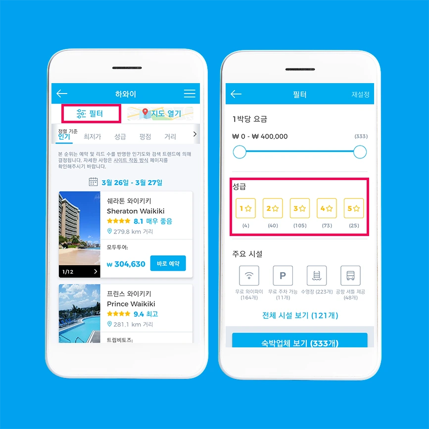 하와이호텔을 호텔 성급별로 필터링해서 찾고 싶다면 호텔스컴바인을 이용해보시면 어떨까요? 여행 숙소를 정할 때 중요한 결정기준 중 하나가 바로 호텔 성급인데요. 절대적인 것은 아니지만 특정 호텔이 일정 성급 이상을 보유하고 있다면 그에 상응한 시설과 서비스의 수준을 갖추고 있음을 짐작할 수 있답니다. 원하는 호텔성급을 체크한 뒤, 필터링하고 확인해보세요!