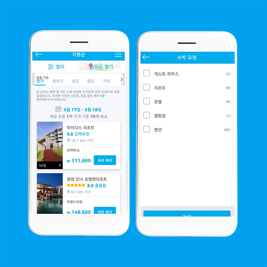 여행의 상황에 따라 원하는 숙소유형이 다르기에 가평여행에서는 특히 다양한 숙소유형을 고려하게 되는데요. 다양한 유형의 숙소들을 필터 설정으로 검색해 모아서 보세요! 출장이 목적이라면 비즈니스호텔이, 가족여행이라면 리조트 또는 펜션이 혼자여행을 떠난다면 게스트하우스가 좋을 수 있겠죠? 여행의 목적에 맞게 숙소 유형을 체크해보세요!^^