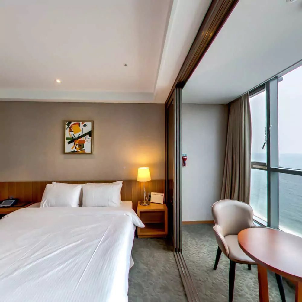 객실 창문이 통창으로 되어 있고, 전자식 블라인드를 설치해 놓아 객실 문을 여는 순간 이 블라인드가 자동으로 열리면서 바다를 한눈에 감상할 수 있답니다. 호텔에 머물면서 대천해수욕장과 보령 머드 체험관 등을 즐겨보시면 어떨까요?