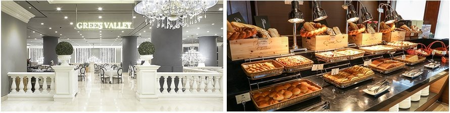 프렌치 모닝 뷔페 공간- '그린 밸리'특급 호텔 셰프가 직접 만들어 맛과 건강까지 챙긴 음식들을 즐길 수 있는 프렌치 모닝 뷔페 장소입니다. 고급스러운 분위기가 물씬 풍기는