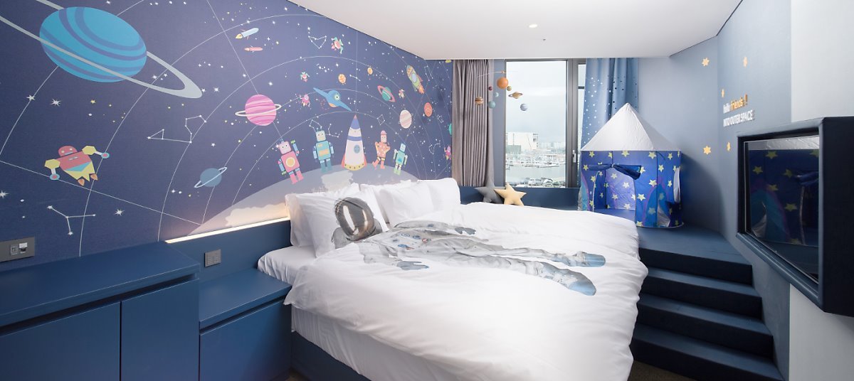 유아 전용 변기와 수전 등 아이들을 배려한 요소도 놓치지 않았는데요. 모든 객실에는 더블과 싱글베드가 합쳐진 크기의 맘모스 사이즈의 침대를 적용, 3인 이상의 고객들도 넉넉하게 숙면할 수 있답니다. 뿐만 아니라 활동성이 많은 아이들을 고려해 바니와 스페이스, 지라프 객실 침대 측면에 플레이매트를 설치해 안전하게 뛰어놀 수 있도록 했답니다.
