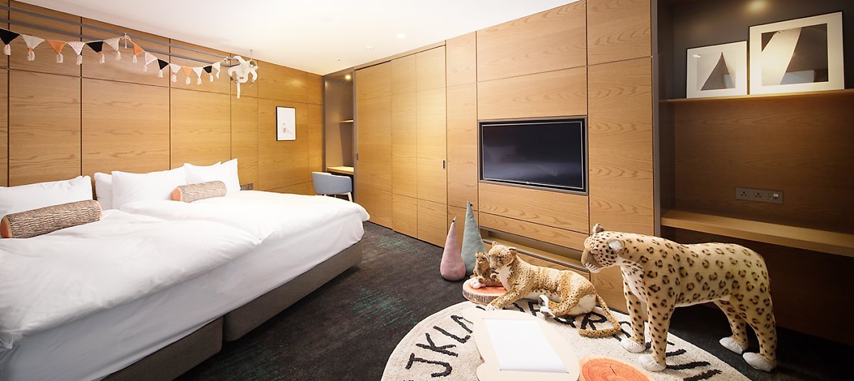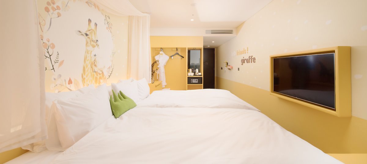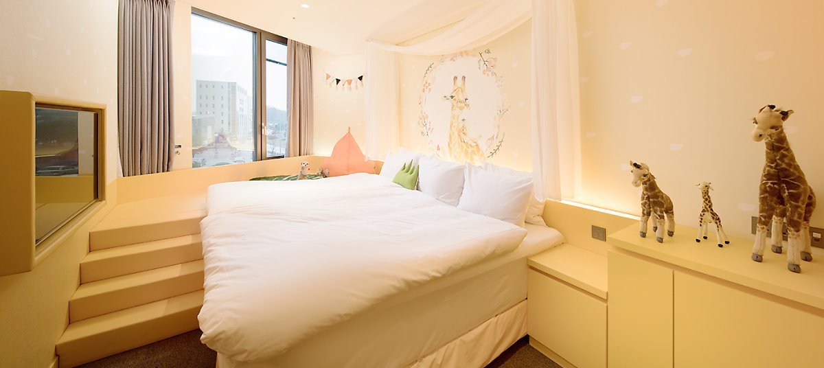 새롭게 선보이는 5가지 테마의 캐릭터룸을 주목해보시면 좋은데요. 동심을 자극하는 캐릭터룸을 최근에 오픈하며 호캉스족 잡기에 나섰답니다. 토끼, 기린, 공룡, 사자 등 아이들의 선호도가 높은 동물을 소재 삼아 객실 전체를 편안한 플레이룸으로 디자인했으며, 총 7개 객실이 마련되었는데요. 아이들뿐만 아니라 친구들이나 연인과 함께 파자마