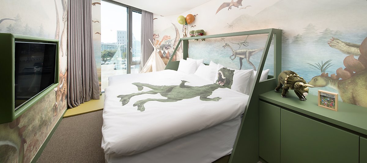 공룡을 소재로한 ‘디노’ 룸은 벽면에 공룡의 모습을 그려 넣어 탐험을 온 듯한 분위기를 만끽할 수 있는 공간인데요. 초록 색상을 활용해 자연의 느낌을 살린 것이 특징으로 객실 곳곳에 아이들의 상상력을 자극하는 공룡 인형을 배치해 지루할 틈 없이 놀 수 있도록 했답니다. 객실 한 켠에는 가족 또는 친구들과 함께 추억 사진을 남길 수 있는 인디언