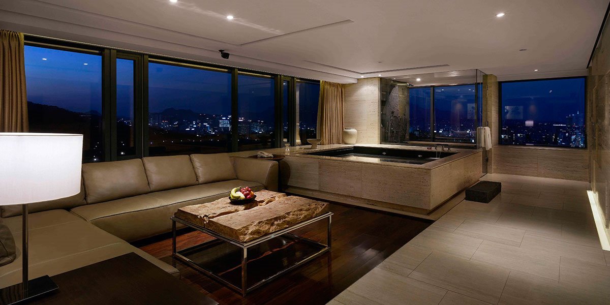 남산 풀 스위트는 침실과 거실이 분리되어 있어 더욱 여유로운 휴식을 즐기실 수 있는데요. 서울의 랜드마크인 N서울타워의 아름다운 모습을 펼쳐진 넓은 거실에는 릴랙세이션 풀이, 거실 안 쪽에는 아늑한 분위기의 침실과 탁 트인 전망이 펼쳐진 넓은 욕실이 자리하고 있습니다. 남산의 우아한 곡선과 시시각각 변하는 서울의 화려한 모습이 펼쳐진