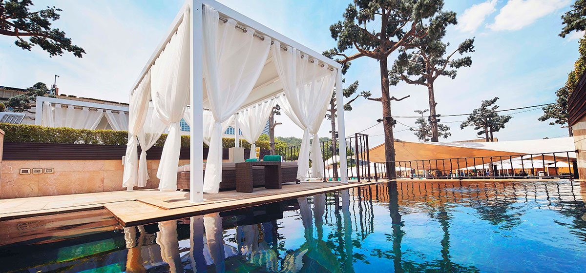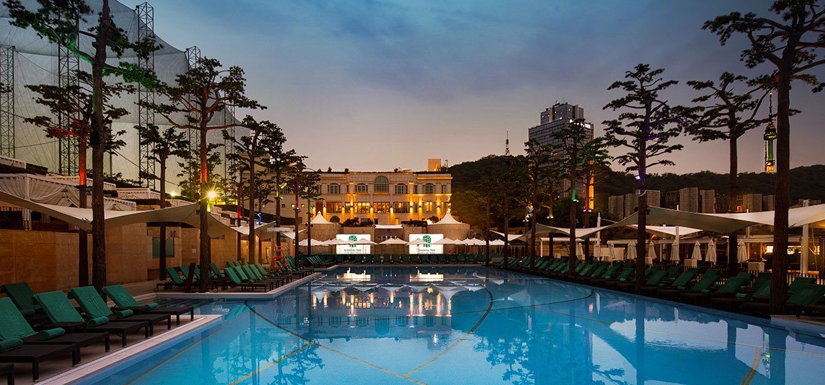 호텔 객실 맞은편 클럽동에 수영장이 있는데요. 오아시스 야외 수영장은 남산의 상쾌한 전경이 펼쳐진 아름다운 숲 속에서 완벽한 도심 속 휴식을 선사하는 장소입니다. 글로벌 호텔 체인 브랜드인 ‘반얀트리’의 자연친화적인 이미지에 걸맞게 돌, 나무 등 자연소재로 마감하여 오래 머무를수록 더욱 편안해지는 분위기로 조성되어 있습니다. 해외 반얀트리 리조트 풀빌라의 느낌을 재현한 23개의 카바나에는 개인 풀이 마련되어 있어 더욱