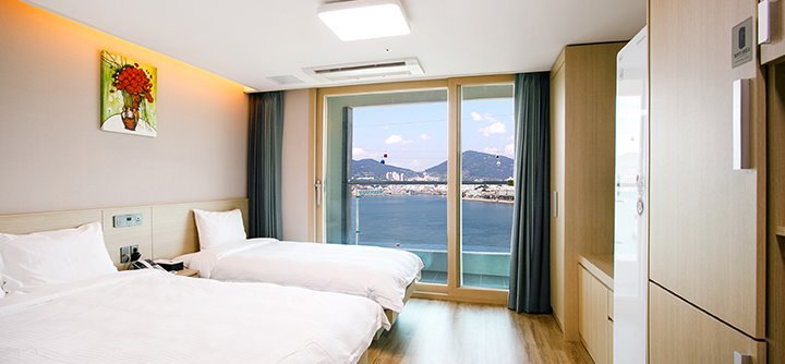'더 호텔 수'는 객실 내 테라스에서 여수 바다를 감상할 수 있다는 것이 큰 장점인 호텔인데요. 낮과 밤, 어느 때나 그 모습은 찬란히 빛난답니다. 객실은 '스탠다드, 디럭스, 패밀리, 스위트' 객실로 구성되어 있는데요. 특히, 'Standard Twin'객실은 바다전망 발코니, 전자레인지, 커피포트 등 간단한 취사도구와 더블베드 1개와 싱글베드 1개로 친구, 가족 단위 여행분들께 가성비甲 객실로 통한답니다!