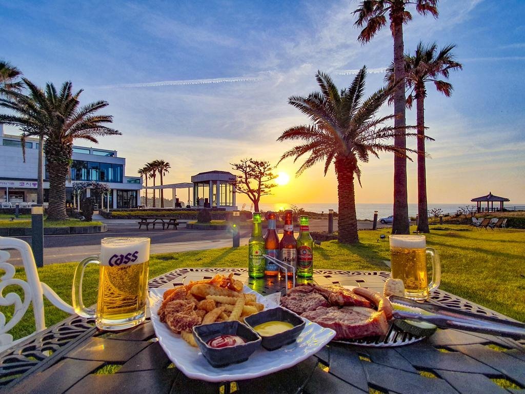 애월 바다가 한눈에 보이는 '야외레스토랑 코시롱'은 흑돼지 숯불구이와 Fresh 딱새우회, 해산물, 라이브공연이 있습니다.