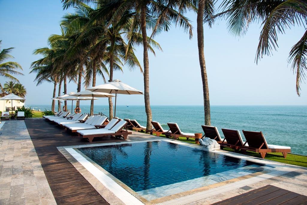 프라이빗 비치와 넓은 수영장을 보유하고 있어 호이안여행객에게 높은 인기를 자랑하는 선라이즈 프리미엄 리조트 호이안.