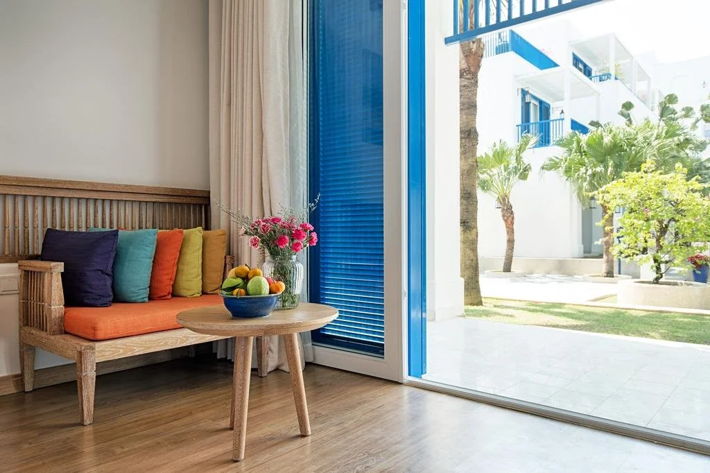 63㎡의 시티 뷰 또는 정원 뷰인 산토린 스위트는 밝고 넓은 인테리어로 현대적인 어메니티와 전통적인 특징이 조화되어 완벽한 힐링의 휴가를 선사하는데요. 킹사이즈의 침대를 갖춘 별도의 침실, 안락한 소파와 작은 다이닝 테이블의 거실과 개별적인 발코니가 있답니다.