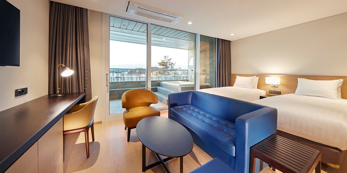 특히 전 객실이 경포해변 또는 경포호수를 바라보고 있어 훌륭한 조망을 자랑할 뿐만 아니라, 모든 객실이 테라스를 가지고 있으며 2층 객실 테라스의 경우 기포욕조인 ‘자쿠지’가 구비돼 있어서 더욱 편안한 휴식공간을 제공한답니다.