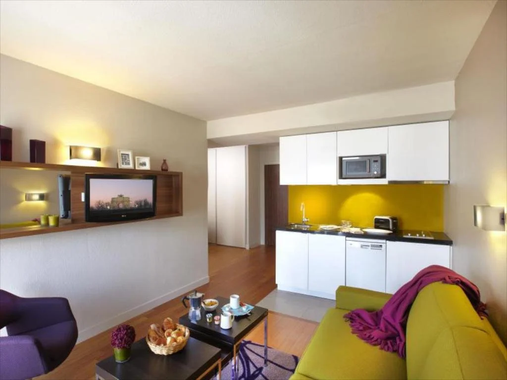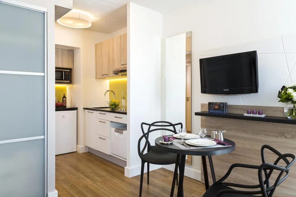 샤를미셸 역에서 도보 6분 거리에 있는 아파트호텔 아다지오 파리 센터 투르 에펠. 아파트형 숙소라 냉장고, 객실내 식사 공간, 커피 메이커 등이 여유로운 갖춰져 있는데요.