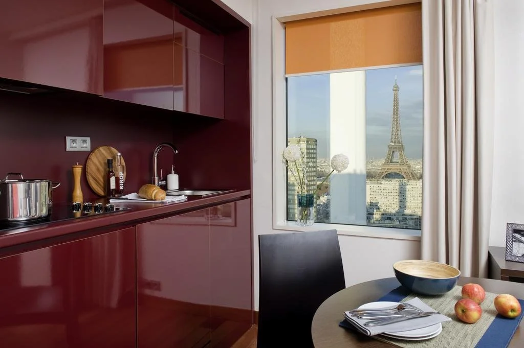 1층에 위치한 한인마트에서 식재료를 산 뒤 숙소 주방에서 직접 요리를 해 먹어도 좋을 것 같습니다. 밤낮으로 보이는 에펠탑뷰는 객실에서 보이는 멋진 전망을 선사합니다.