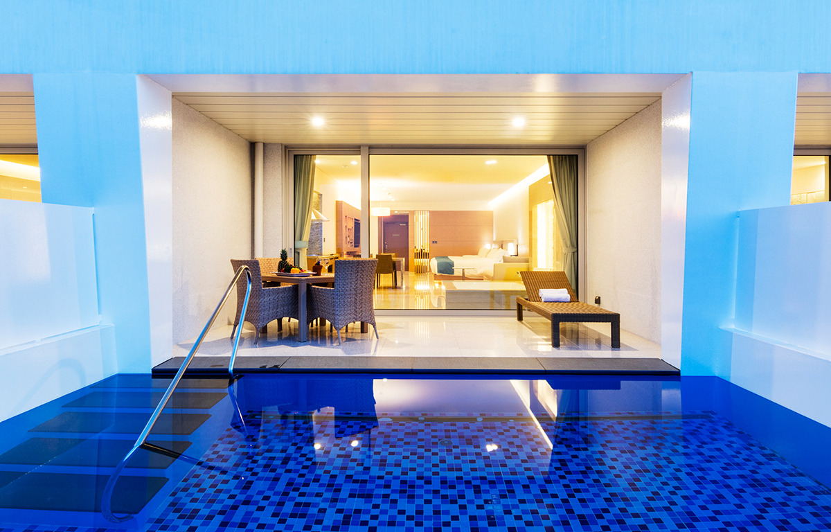 썬크루즈 리조트 & 요트는 외부에 있는 야외 인피니티풀도 매우 유명하지만, 로열 스위트룸에 구성되어 있는 프라이빗한 인피니티 풀이 이색적입니다. 리조트 최고 상위 층에 구성되어 있어 동해바다를 아주 멋진 위치에서 감상할 수 있고, 함께 여행 온 사람들끼리만 수영장을 즐길 수 있다는 것이 가장 큰 메리트인 것 같습니다. 야외 테라스도 넓게 구성되어 있어 모두 함께 풀파티도 즐길 수 있습니다.