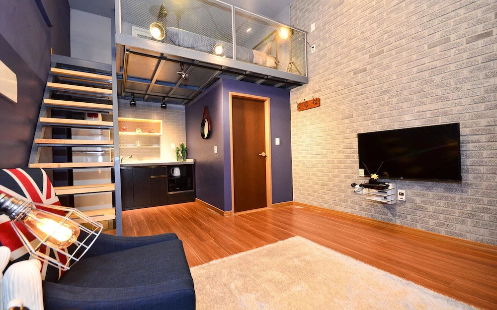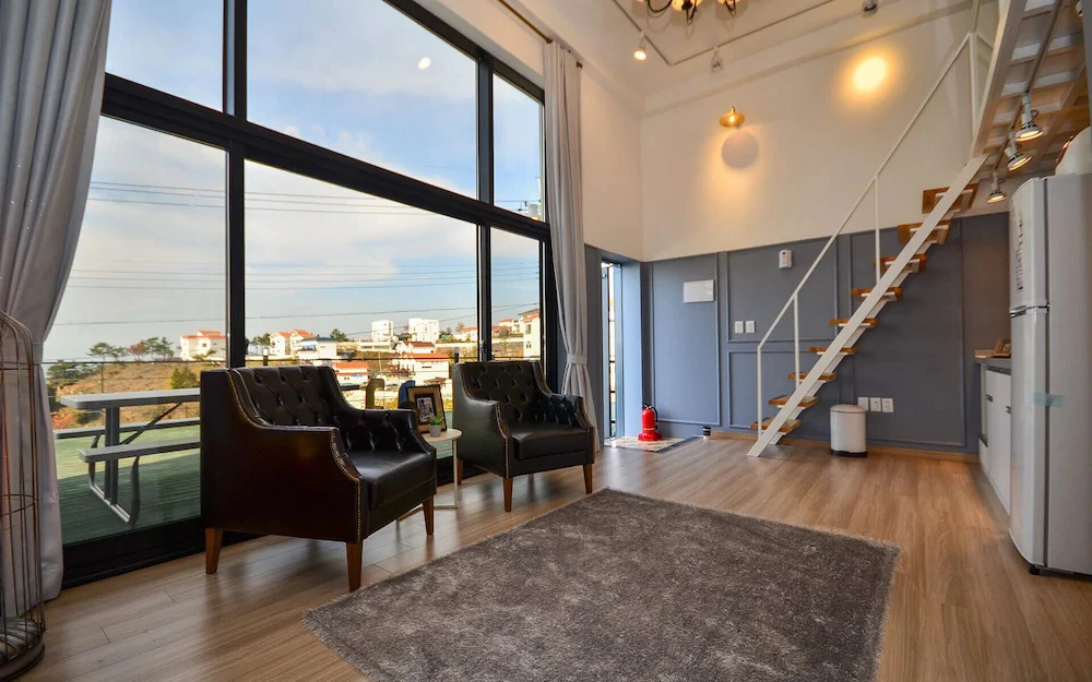 복층 객실의 1층은 간이 주방과 화장실이 있고, 2층은 침실로 사용하실 수 있습니다. 전면부에는 높은 층고를 가득 채운 창이 있고, 거실과 침실 모두에서 밖을 조망할 수 있어서 객실 전체가 밝은 편입니다. 어린아이들과 동반한 가족 여행객들은 2층 침실 대신 침구류를 추가하여 1층을 침실처럼 사용하시는 것도 좋습니다.