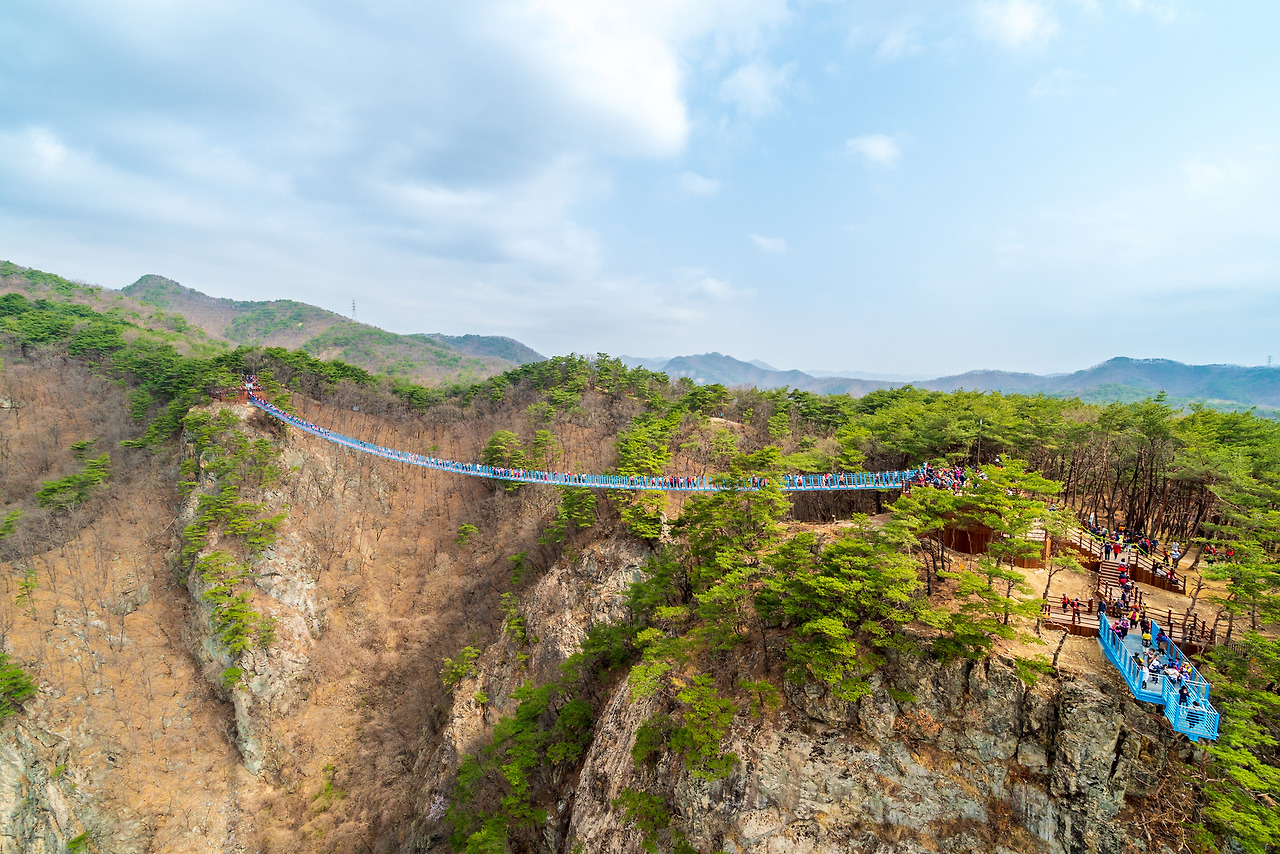 섬강과 삼산천 강물이 합수되는 지점에 있는 다리인데요. 주변의 기암괴석 때문에 더 스릴 있고 아름다운 산 속에 와있다는 느낌 마저 드는 곳입니다. 다리가 흔들거리기 때문에 아름다운 자연을 관망하면서 다리를 건너는 짜릿함을 견뎌내면서 추억을 쌓는 관광객들도 많다고 합니다.