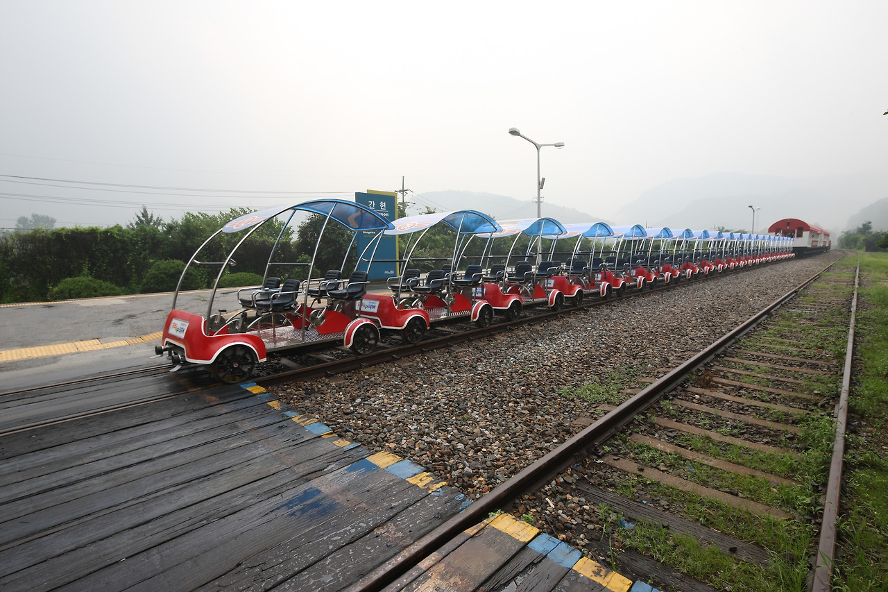 레일 바이크를 이용하면 간헌역에서 풍경 열차를 타고 판대역에서 내려서 레일바이크를 타고 다시 간헌역에 올 수 있습니다. 이 바이크를 타면서 보이는 드넓은 섬강의 아름다움을 만끽할 수 있다는 것이 최대 장점입니다. 특히 6개의 이벤트 터널을 지나면서 화려한 조명이 빛나는 구간을 지날 때는 사진 촬영을 하기에도 좋아요.