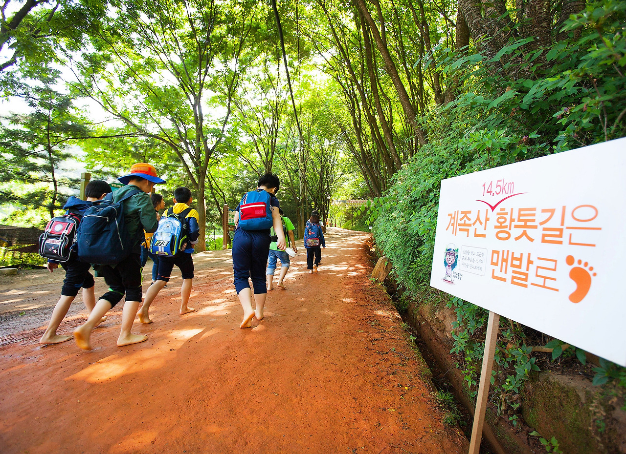 대전의 외곽 동쪽에 자리한 계족산에는 황톳길이 있는데요. 장동산림욕장 입구-원점 삼거리-임도 삼거리-절고개 삼거리-원점 삼거리-장동산림욕장 입구까지 이어지는 총 14.5km의 코스로 매끄럽고 부드러운 길이라고 합니다. 황토는 미생물을 품은 효소들이 있어 몸의 순환 작용을 돕는다고 하는데요. 날이 춥지 않으면 맨발로 나무 사이를 걸어봐도 좋겠네요.