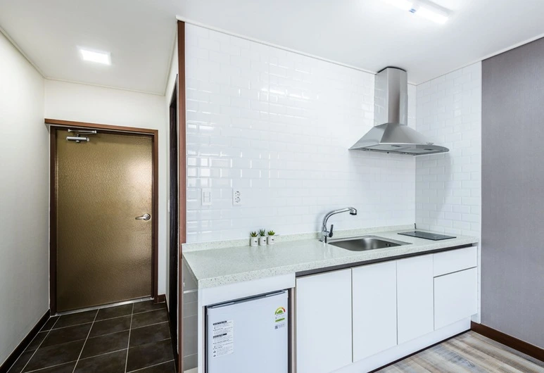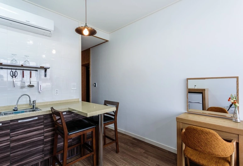 객실 내에는 온도 조절기가 있으며 별도의 식사 공간과 좌석 공간이 함께 있습니다. 욕실에는 무료 세면 용품과 레인폴 샤워기가 장착되어 있고, 냉장고와 전자레인지, 스토브, 조리도구가 함께 있는 간이 주방을 편리하게 사용할 수 있어요. 정수기가 숙소에 비치되어 있어서 따로 생수를 살 필요가 없다는 점도 장점입니다.