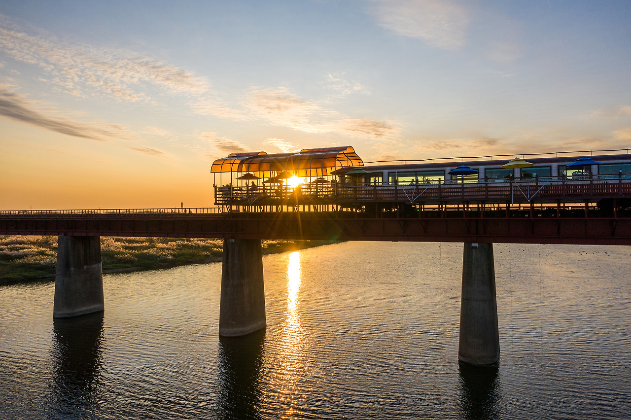 만경강을 가로지르는 폐 철교 위에 있는 열차인데요. 완주군에서 4량의 새마을호 폐열차를 구입해서 리모델링한 후 만든 예술열차라고 합니다. 1량은 레스토랑, 1량과 2량 사이는 음악 공연장, 2량은 특산품 판매점, 3량에는 편의점과 갤러리, 4량에는 카페로 되어 있는데요. 열차 안에서 즐기는 복합 문화를 경험해봐도 좋을 듯하네요.