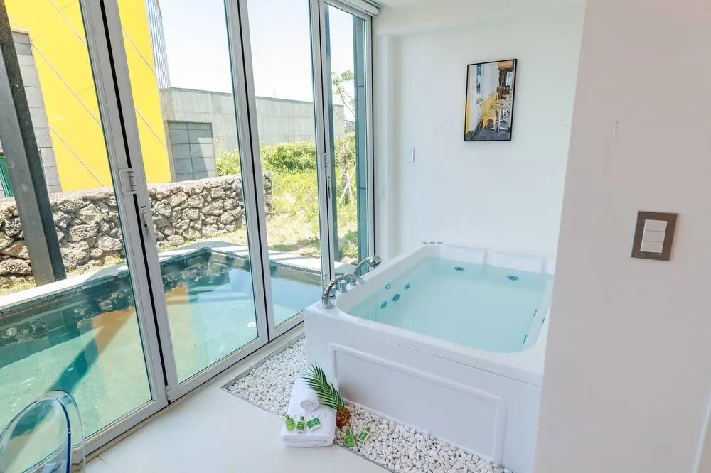 제주 중문에 위치한 이 호텔은 집처럼 캐주얼하게 투숙할 수 있는 숙소입니다. 약천사를 도보로 6분 안에 갈 수 있고 주상절리 절벽이나 베릿내 또한 가까이 있습니다. 숙소 내에는 조리 도구와 접시, 주방 기구, 전자레인지가 있는 주방이 있으며 욕실에 전용 스파 욕조가 따로 있어 힐링 타임을 갖기에도 굉장히 좋습니다.