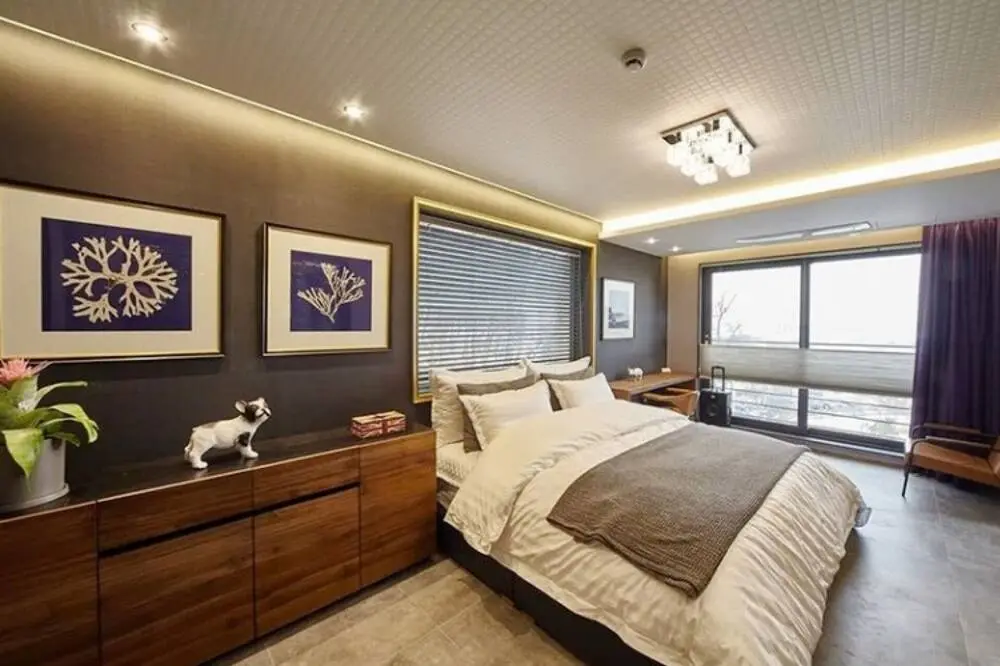30cm 두께의 통 메모리폼 베드를 사용한 침대와 90% 솜털의 헝가리산 구스로 만든 이불과 베개, 순면 80수 시트를 비치해서 숙면하기에 굉장히 좋은 조건을 갖추고 있습니다. 펜션 근처에는 출렁다리와 마장 호수가 있어서 산책하기에 좋고 5분 거리에 대형 마트가 있으며 배달 음식을 시키기에도 편리한 조건입니다.