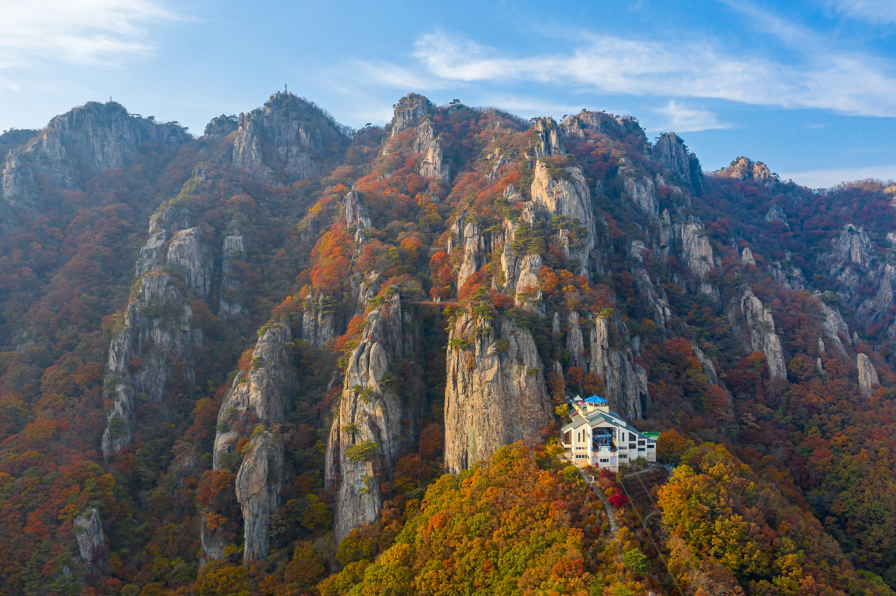 금산 지역에서 독립된 산군을 이룬 대둔산은 사방으로 산줄기가 어우러져 칠성봉, 장군봉 등과 멋진 암봉을 이루고 있습니다. 사방으로 기암괴석과 수목이 어우러져 굉장히 아름다운 산세를 자랑한다고 해요. 이 높은 산은 오르려니 조금 아찔할 수도 있겠지만 5분 정도 케이블 카를 타고 가면 되니 안심하셔도 됩니다. 케이블카를 타고 내려 구름다리를 타서 보는 경치도 아름답고, 일출이나 일몰 시기에 맞춰서 낙조대에 올라도 황홀한 경치를 볼 수 있습니다.