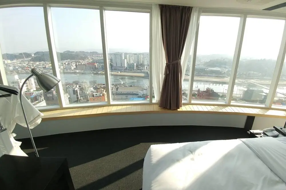 “우선 뷰가 정말 좋습니다. 바다는 멀어서 잘 안보이지만 산과 강이 보이는 뷰고 앞을 가리는 것도 없습니다. 길게 이어진 객실 한쪽이 다 통창이라 뷰는 좋지만 밤엔 조금 춥고 낮엔 조금 덥습니다. 시설은 전반적으로 깔끔하고 실용적으로 되어있고, 욕실이 넓고 깨끗한점이 특히 좋았습니다. 호텔 직원들은 모두 아주 친절했고, 서비스도 좋습니다.”