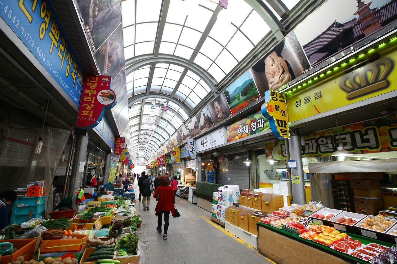 경주 성동시장은 경주의 가장 유명한 재래시장 중 한 곳으로 경주의 특색과 분위기를 느끼기에도 좋은 장소입니다. 경주 특산품과 먹거리를 볼 수 있는 것은 물론, 지역의 문화유산 250여 점을 사진으로 담아 아케이드 벽면에 게시해 두었다고 해요.
