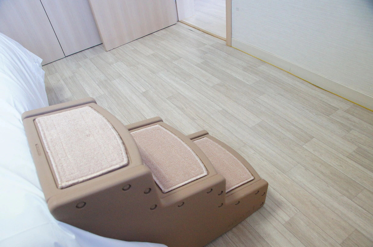 객실 내에는 알러지 진드기 방지 쿠션이 있는 강아지 침대가 있습니다. 뿐만 아니라 논슬립 강아지 계단과 강아지 식기 세트, 배변판과 배변 패드, 극세사 타월 등의 다양한 강아지 어메니티들을 제공하고 있어 편리하게 이용하실 수 있어요.