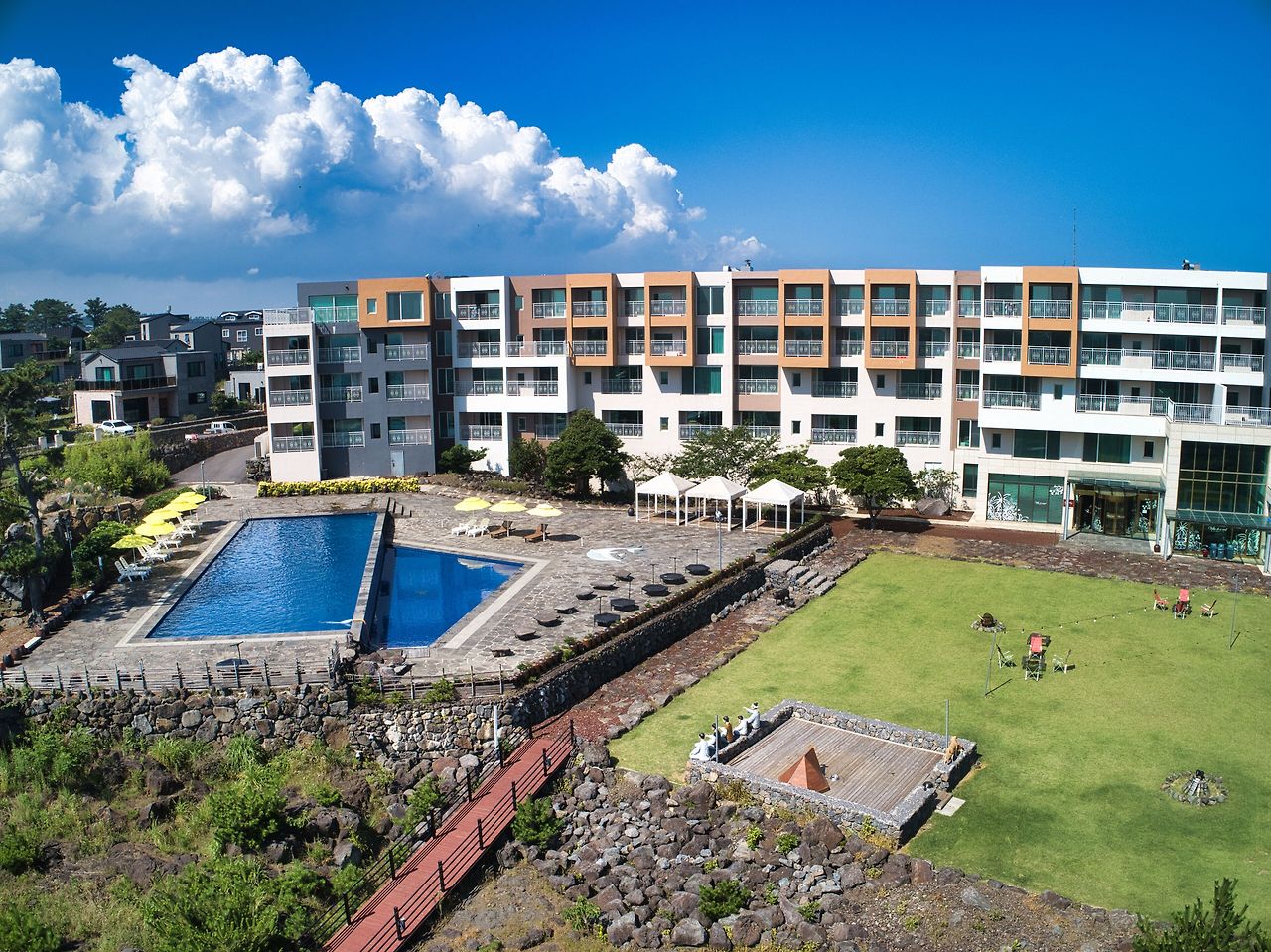 애월 해안도로에 위치한 빌라드애월은 해안도로의 탁 트인 절경을 즐길 수 있는 숙소입니다. 호텔 내부에는 봄부터 가을까지 운영하는 야외수영장을 성인풀과 유아풀로 나누어 운영하고 있는데요. 여름에는 냉수, 가을에는 미온수로 운영하고 있습니다.