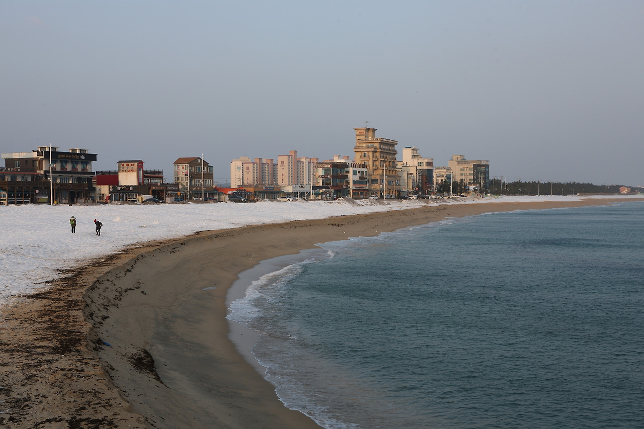 안목해변의 안목은 남항진에서 송정으로 가는 마을 앞에 있는 길목이라는 뜻을 가지고 있어요. 지평선이 끝까지 펼쳐져 바다의 경치를 한눈에 담기 좋습니다. 게다가 길목을 두고 카페가 즐비하게 생겨나 커피 거리로도 유명한데요.