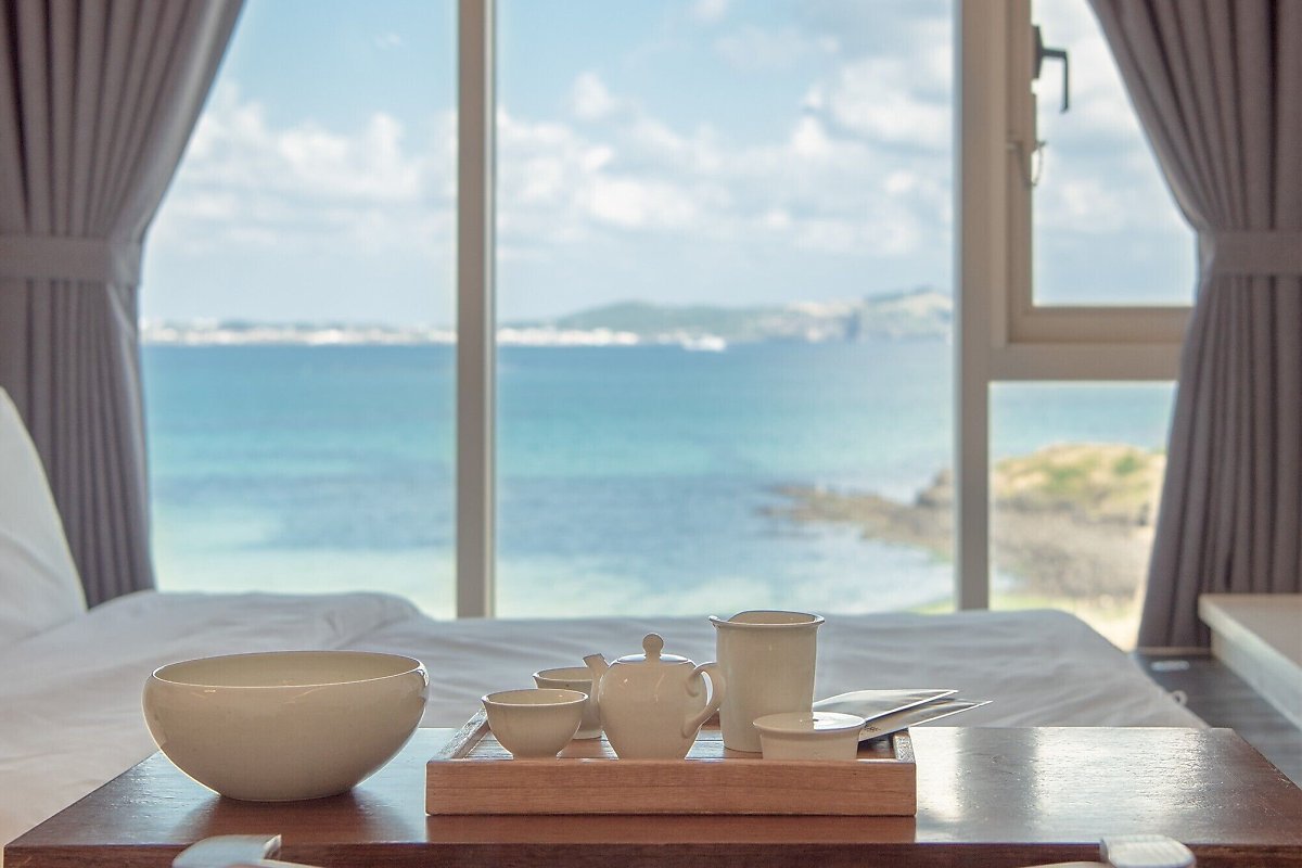 객실에서 보이는 탁 트인 전망과 따뜻한 차 한 잔을 마시며 힐링할 수 있는 이 숙소는 취다선 리조트입니다. 성산포항 여객터미널과 차로 3분 거리에 있어 우도에 방문하기도 좋아요.