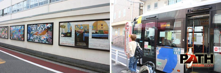길 건너 맞은편에는 예술의 거리임을 알려주는 듯 벽화들도 재미있다. 좁은 골목을 지나다니는 버스 마저 귀여운 키치죠지.