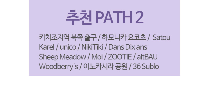 키치죠지는 별다른 목적지를 두지 않고, 역 주변 쇼핑몰인 ‘아트레(atre)’를 비롯, ‘파르코’(PARCO)와 도큐(TOKYU), 마루이(OIOI) 백화점을 랜드 마크로 하여 걷기만 해도 여유롭게 즐길 수 있는 루트로 이어져 있다. 혹자는 길을 잃어도 좋은 곳이 바로 이 키치죠지라 할 만큼, 길 잃을 걱정 없이 자유롭게 보고, 느끼고, 먹는 재미의 삼박자의 조화가 돋보이는 곳이기도 하다.