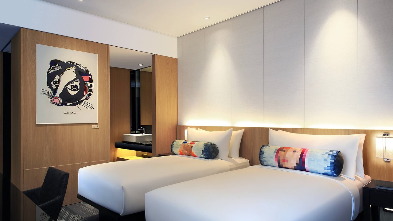 알로프트 타이베이 중산의 객실은 큰 규모는 아니지만, 공간을 짜임새 있게 잘 활용하여 객실이 좁게 느껴지진 않습니다. 객실은 전체적으로 심플한 인테리어로 구성되어 있고, 그림, 쿠션 등 다양한 소품들로 포인트를 주어 격실 전체가 매우 감각적으로 구성되어 있습니다.