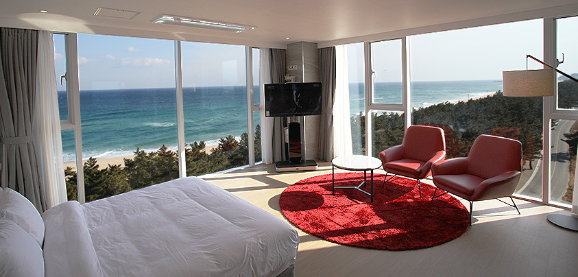 동해바다로 여행을 왔다는 건 무엇보다 바다를 보기 위한 목적이 가장 크지 않을까요? 바닷가에 가서 직접 바다를 보는 것도 좋지만, 객실에서 낭만적인 분위기와 함께 오션뷰를 감상하는 것도 정말 멋진 경험입니다. 특히 커다란 창에서 보이는 푸른 동해 바다는 아침 해가 뜰 때에는 환상적인 오션뷰로 한층 더 업그레이드되는 일출을 볼 수 있습니다.