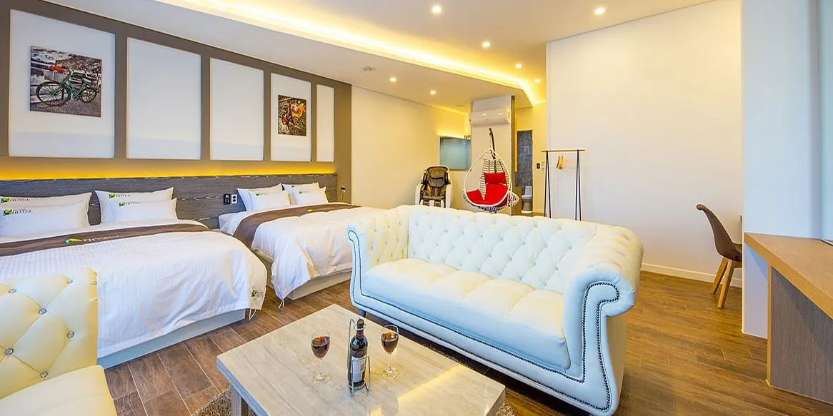 2인이 묵을 수 있는 기본형 객실인 스탠다드룸은 더블 침대와 쇼파와 티 테이블, 기본 어메니티와 욕실 외에도 별도의 스파 시설도 갖추고 있음에도 1박 9만원 대라는 착한 가격으로 묵을 수 있어 가성비도 꽤 좋은 편이랍니다. 4인이 묵을 수 있는 로얄 스위트룸은 킹베드와 컴퓨터, 쇼파, 테이블 외에도 안마 의자와 스타일러까지 갖추고 있어 더욱 쾌적한 환경을 제공하죠.