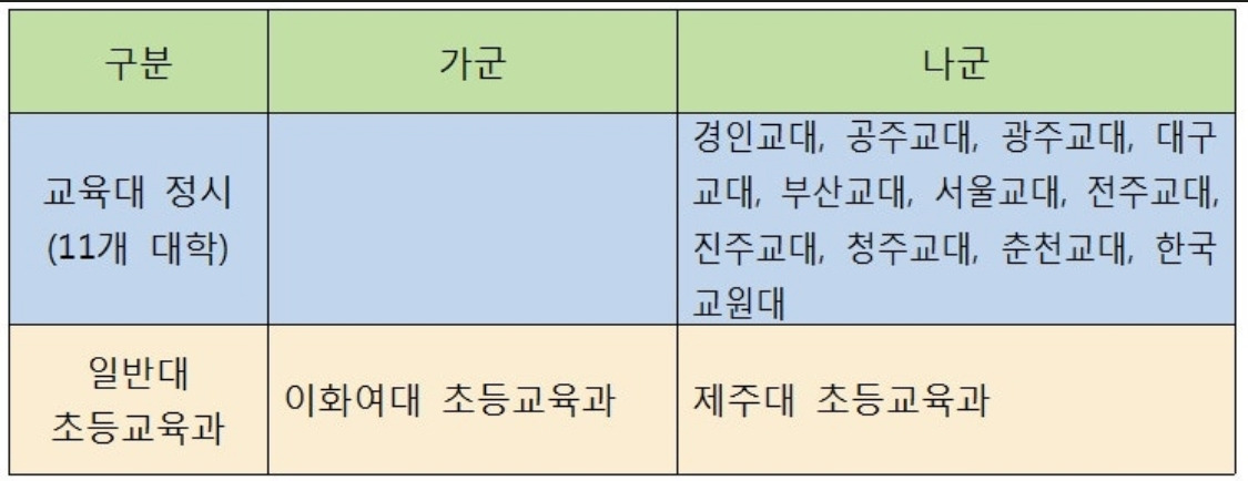 교대는 일반대 이대 초등교육과를 제외하고 ‘나군’에 다 몰려있어서 단 한 곳에만 지원할 수 있다. 선생님이 되는 것 이외에 다른 것은 생각해 본 적이 없기에 가군, 다군은 아예 보지도 않고 나군에 교대 한 곳만 올인했다.