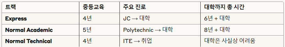 Express(4년, 중등교육)-"O-level test"-Junior College(2년, 고등교육) -"A-level test"- 대학교 진학