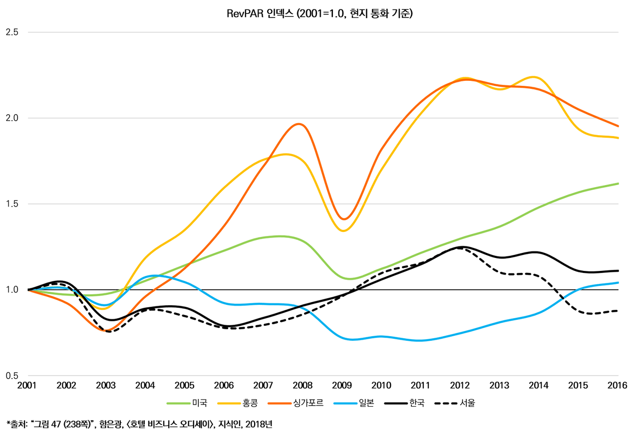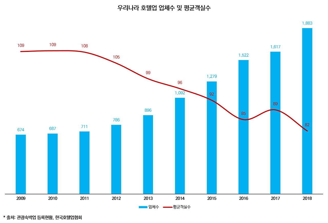물론, 여기에서 예외였던 나라가 있기는 합니다. 바로 우리나라입니다. 우리나라는 한류 열풍을 따라 급성장하던 호텔 시장에 고무되어 2012년 관광숙박시설법을 시행하며 정부가 호텔 공급의 확대에 직접적으로 개입했습니다. 이후 2018년까지 전국 호텔업 사업체수는 연평균 14.1%, 객실수는 연평균 9.8% 증가한 반면, 사업체당 객실수는 105실에서 82실로 영세화되었고 RevPAR 또한 연평균 2.5% 감소하며 호텔 시장이 바닥을 헤매기 시작했습니다.