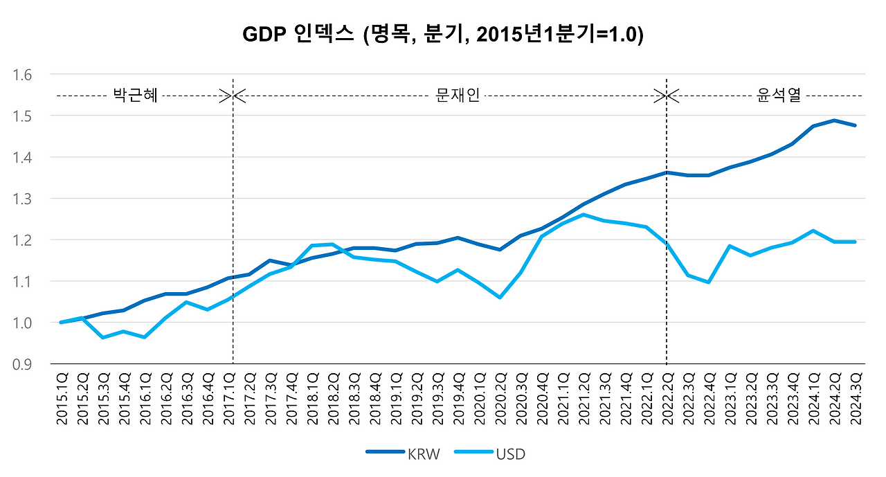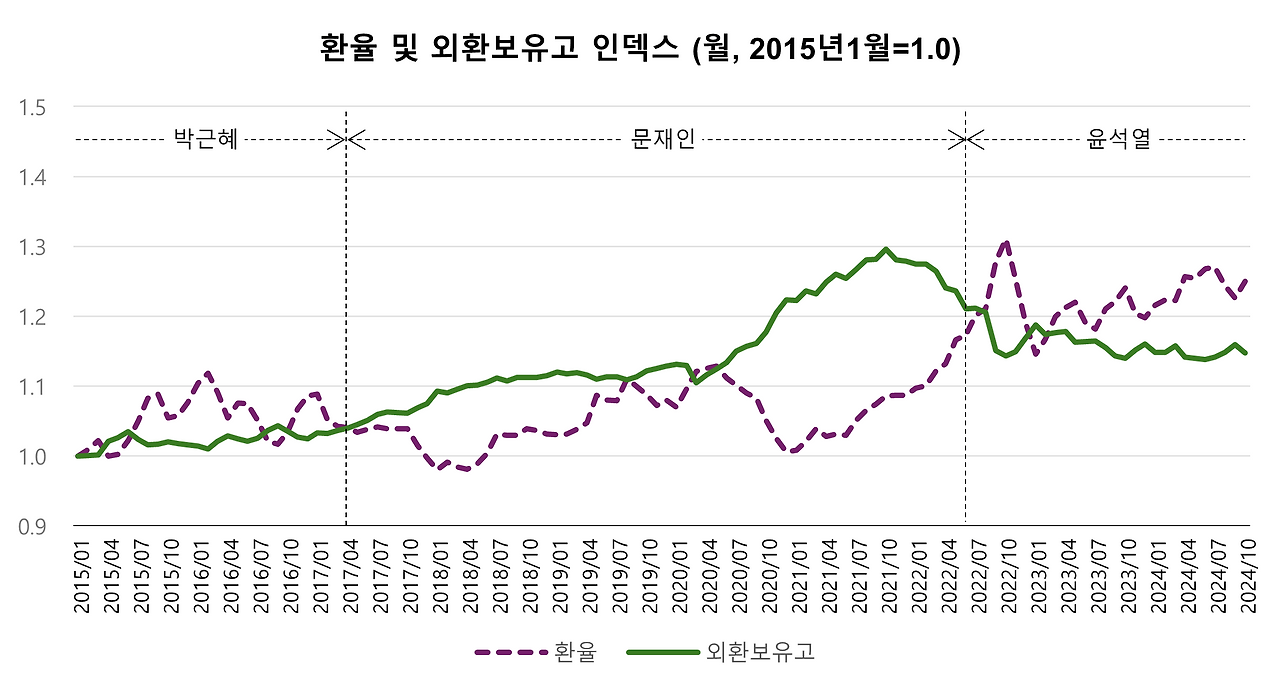 이번 정부 들어, 환율과 외환보유고 변동 추이를 보면 경제 당국은 악전고투했던 것 같습니다. 이런 상황에서, 대통령은 미국 정부로부터 반도체 수출 통제 완화, 새 정부에서 예고된 관세 폭탄의 유예, 2021년 말 종료된 한미 통화 스와프 재개 같은 것들 중 뭐라도 얻어오기 위해 전력을 다했어야 합니다. 사실, 아직은 외환보유고가 박근혜 정부 수준까지 떨어지지는 않았기 때문에, 대통령이 이러한 운신의 폭을 어느 정도 마련해 주었다면, 상황이 조금은 더 쉽게 제어될 수 있었다고 생각됩니다.