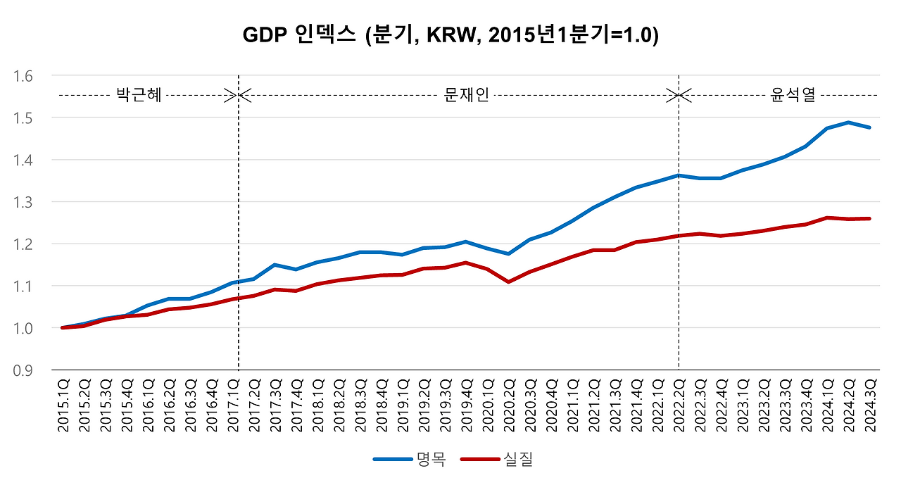 GDP(국내총생산)는 가장 보편적으로 사용되는 경제지표의 하나입니다. GDP는 명목 GDP와 실질 GDP로 구분됩니다. 간단하게, 실질 GDP는 생산액, 명목 GDP는 소비액 정도로 얘기할 수 있을 것 같습니다. 이들 간의 차이는 물가상승률에 의해 발생하게 되는데, 명목 GDP에는 물가상승률이 반영되는 반면, 실질 GDP에는 물가상승률이 반영되지 않습니다. 국가별 GDP 순위 비교에 사용되는 것은 명목 GDP입니다. 우리나라의 명목 GDP와 실질 GDP 모두 지속적으로 성장해 왔고, 큰 문제가 있어 보이지 않습니다.