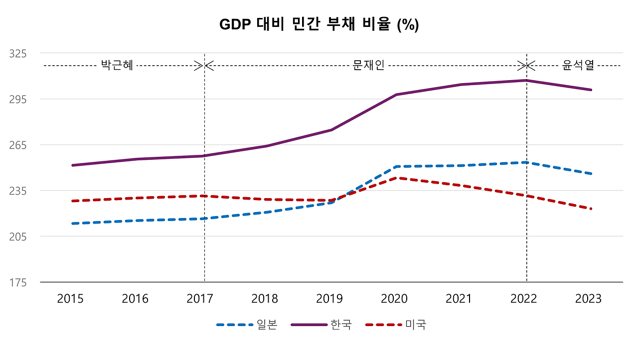 그런데, 왜 우리는 미국의 급격한 금리 인상을 쫓아가지 못하는 것일까요? 가장 큰 이유는 민간 부채에 있습니다. 코로나 기간 다른 나라들과 마찬가지로 우리나라에서도 양적완화 정책이 시행됐습니다. 이를 통해, 원래 다른 나라들에 비해 높은 수준이었던 민간 부채가 GDP의 3배 수준까지 치솟았습니다. 이런 상황에서 금리를 급격하게 끌어올리게 되면, 상대적으로 운신의 폭이 있는 정부 부채와 달리, 민간 부채의 경우 채무불이행이 급증할 수밖에 없고, 이는 금융기관 부실화로 이어지게 됩니다.