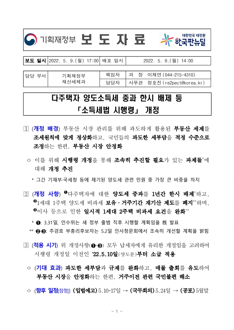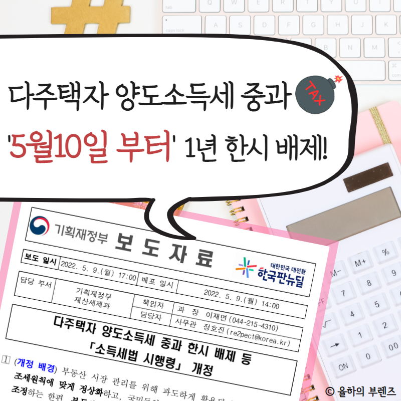 오늘, 방금 핫한 발표가 있었죠. 다주택자 양도소득세 중과 한시 배제 등 [소득세법 시행령] 개정 내용이 바로 5월 10일, 시행령 개정일 전에 당장 내일부터 소급 적용된다는 내용입니다. 한참 동안 얼어붙어있던 다주택자들에게는 봄기운 가득한 날씨처럼 오랜만에 따뜻한 소식이 아닐 수 없습니다