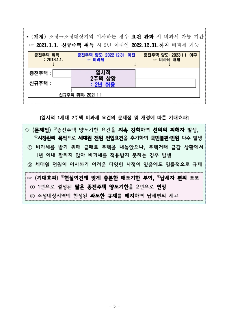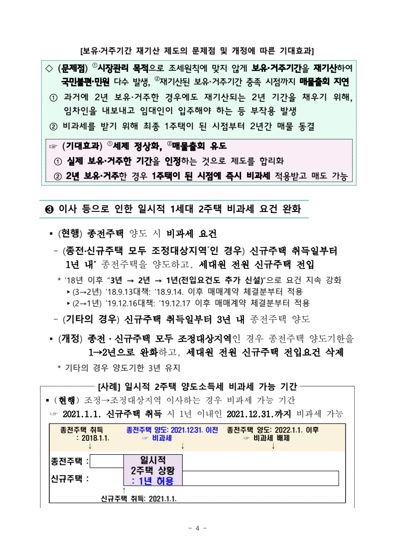 이사 등으로 인한 일시적 1세대 2주택 비과세의 촉박했던 1년의 기간이 2년으로 완화되었습니다. 1년 내에 집을 팔지 못해 비과세를 적용받지 못할까 봐 발을 동동 구르던 것이 기간이 두 배로 연장된 것이지요. 또한, 일자리와 교육 등의 문제로 전원 전입신고를 해야 하는 것에 대해 불편함이 컸었던 세대원 전원 전입 조건 또한 완화되었습니다.