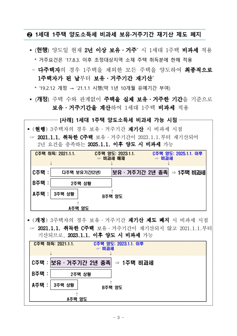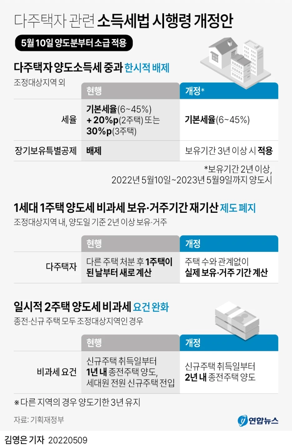또한 현재까지는 다주택자의 경우 모든 주택을 처분 후 최종적으로 1주택자가 된 날로부터 2년의 보유기간, 거주 기간을 채우느라 애를 먹는 경우가 많았는데, 5월 10일 부터는 이 부분이 주택의 개수와 상관없이 실제로 보유, 거주한 기간을 기준으로 1세대 1주택 비과세를 적용합니다. 무조건 그때부터 다시 2년 채우기 시작~! 이 아니게 된 것이죠.